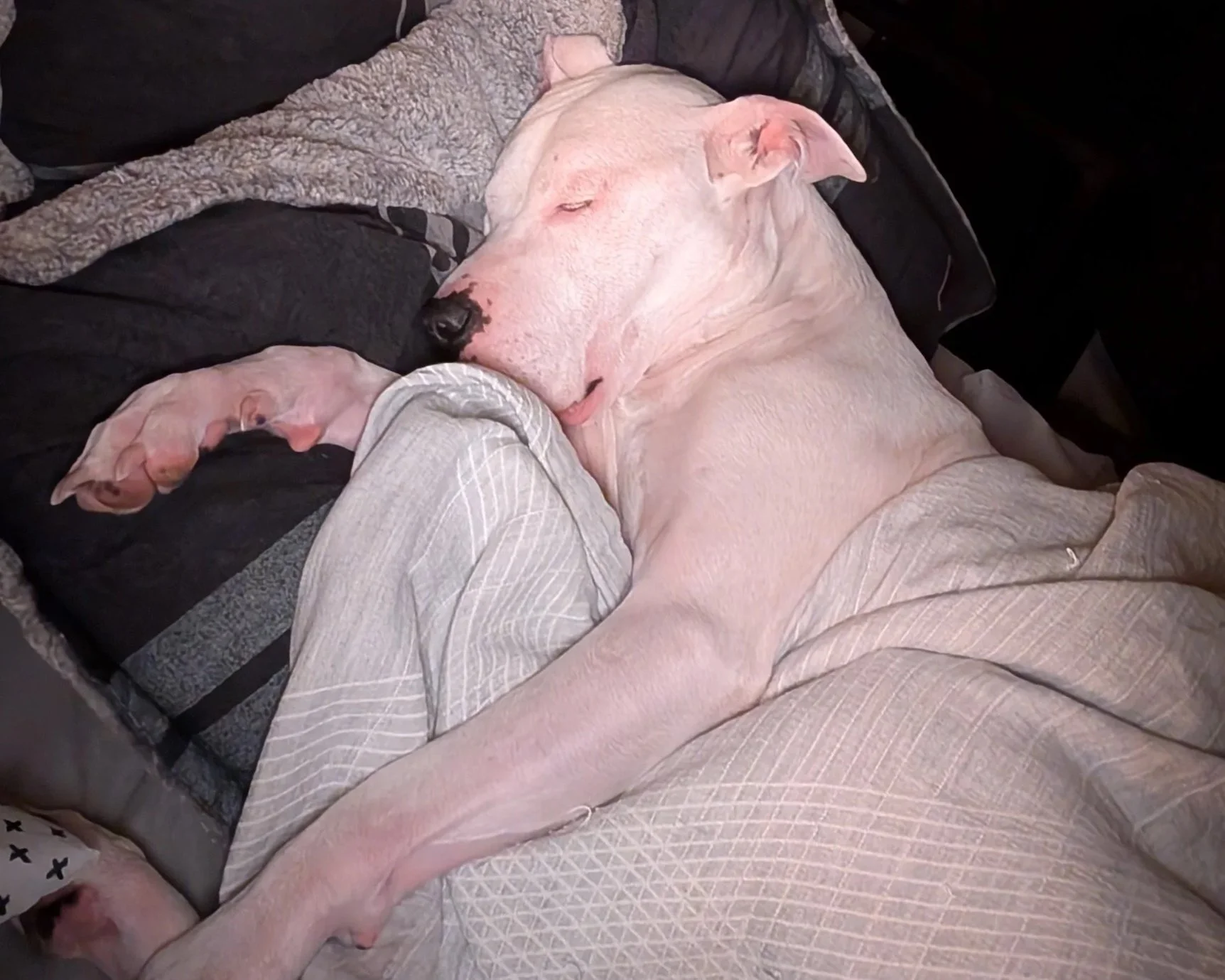 Mom crawls in to bed first. Hulk joyfully hops in after her. They lay together as Hulk rests his head on her shoulder. Jasmine gently scratches his ear. His eyes close. Rich quietly slips in on the other side of the bed. He reaches over and kisses Hulk’s big heart shaped snout.