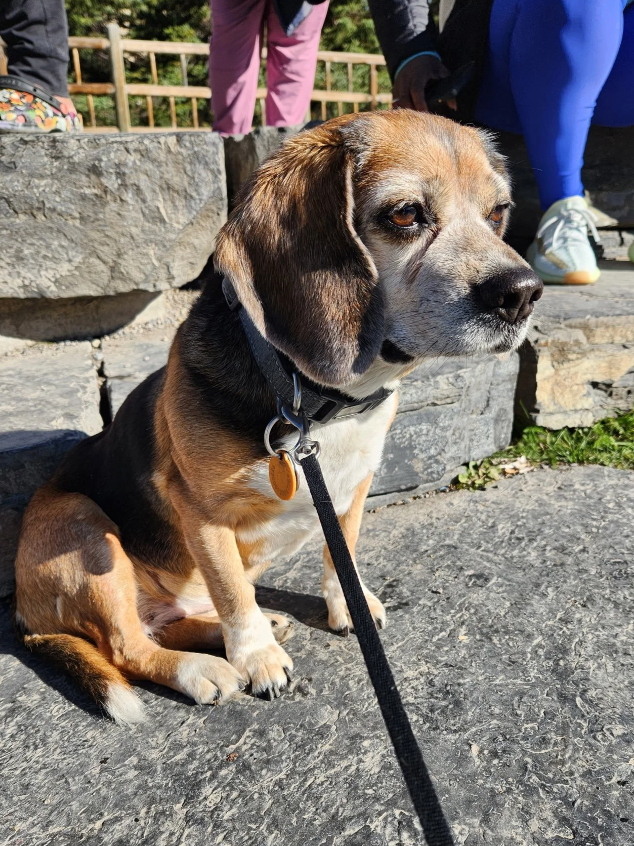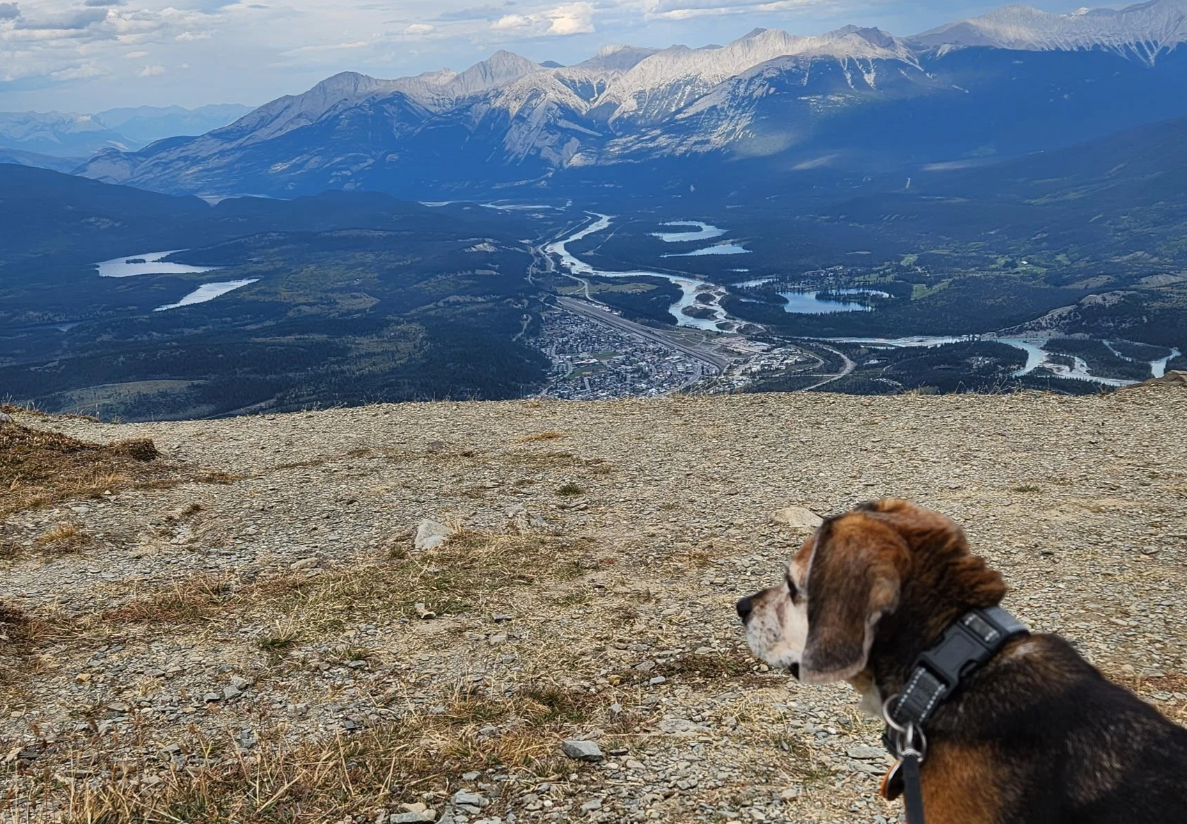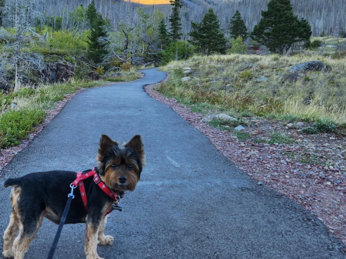 This very happy girl will gladly engage in a neighborhood walk. In her younger days, she would gleefully join Mom and Dad for a invigorating jaunt. She even put on some international miles with her best buddy Lacie, when they travelled to Banff to explore the Canadian Rockies. Today, walks are still welcome, but the duration is a bit shorter. Rahul bends down and picks her up.